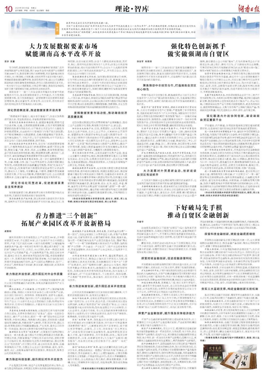 习近平总书记深刻指出“改革开放是中国人民和中华民族发展史上一次伟大革命”,去年在湖南考察时,他嘱托我省着力打造内陆地区改革开放的高地。湖南省委十一届十二次全会提出在全面建设社会主义现代化湖南新征程上推动改革开放实现新突破。湖南如何跃出“内陆樊篱”,加快更深层次改革更高水平开放?湖南大学湖南发展研究院与湖南日报《理论·智库》联合组织策划,约请专家学者建言献策。