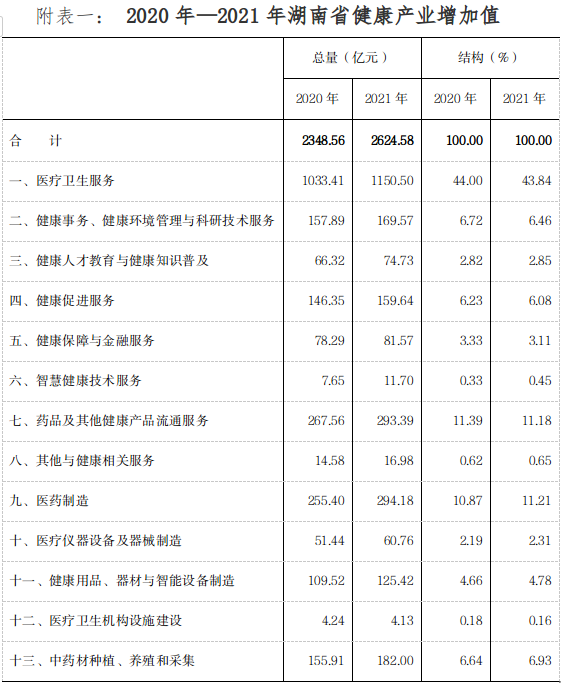 2021年,湖南省健康产业增加值为2624.58亿元,比上年增长11.8%(未扣除价格因素,下同),比同期地区生产总值(GDP)现价增速高0.9个百分点;占GDP的比重为5.70%,比上年提高0.05个百分点。