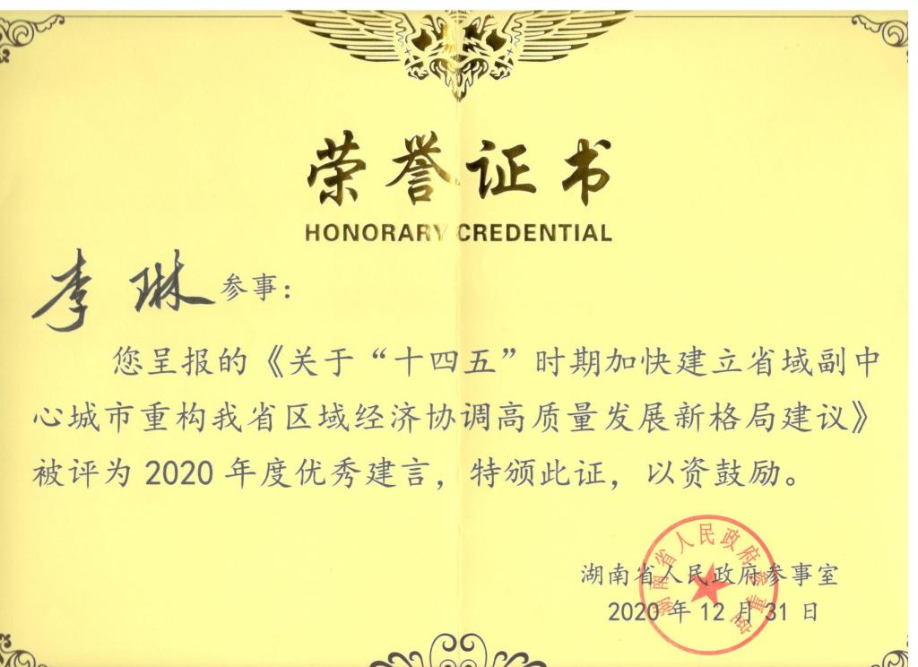 据悉,省委省政府编制湖南省“十四五规划”时,该建议被采纳,建议提出的“加快建设两个省域副中心城市”写进省十四五规划 “建设两大省域副中心城市”部分,这是李琳连续三年呼吁的结果,取得较大社会影响。